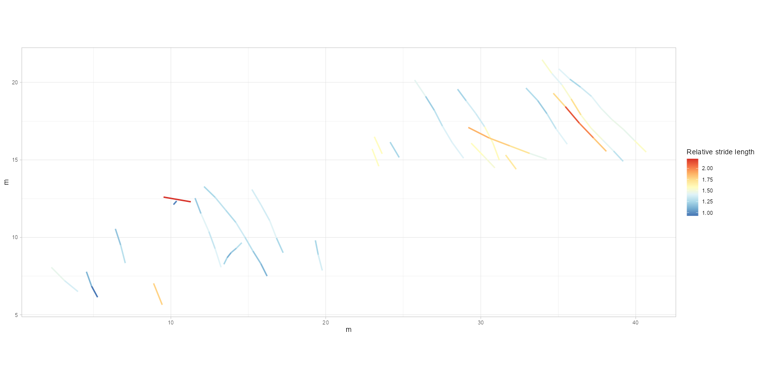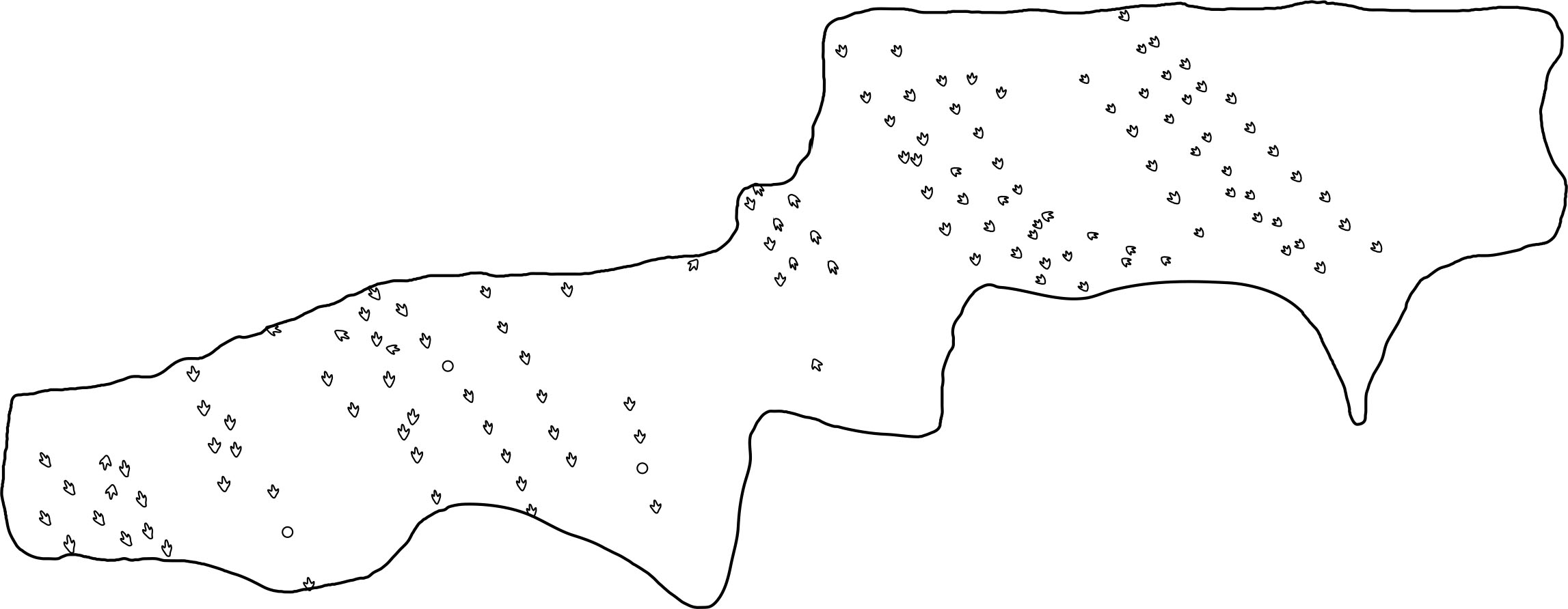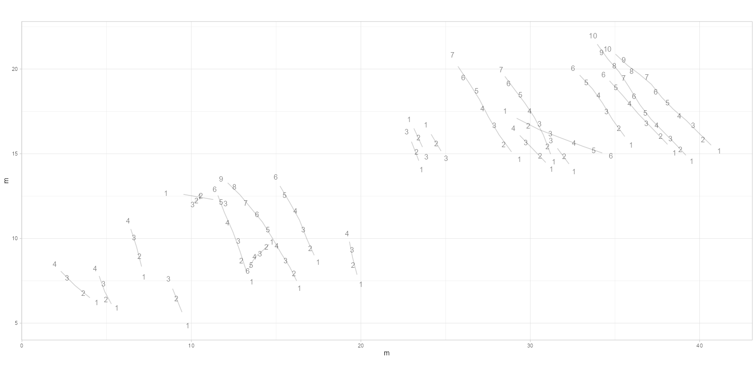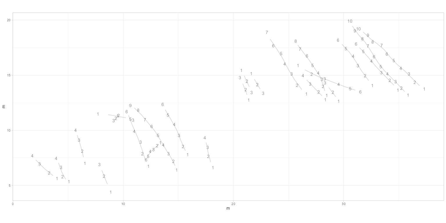 plot_track(PaluxyRiver, plot = "FootprintsTrajectories", cex.f = 4, alpha.t = 0.2, seq.foot = TRUE)